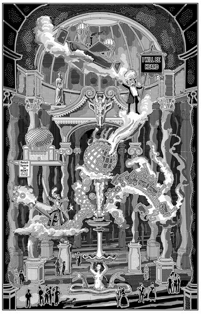 To further debunk the narrator’s accusation of poetic eccentricity, the guide points to another group: the power-brokers and money men who haunt chambers of commerce and capital cities. At first it might seem as though they do not belong in the Hall of Fantasy. Yet the practical-sounding character of their conversation “concealed the extravagance of its purport, insomuch that the wildest schemes had the aspect of every-day realities. Thus the listener was not startled at the idea of cities to be built, as if by magic, in the heart of pathless forests; and of streets to be laid out where now the sea was tossing.” So convincing is this performance that it requires effort to remember that the leader of industry is as bound to fantasy as the poet; he is just better at making his fantasies seem real. As if echoing Socrates’ estimation of the poets, the narrator cries out, “it is dangerous to listen to such dreamers as these. Their madness is contagious.”