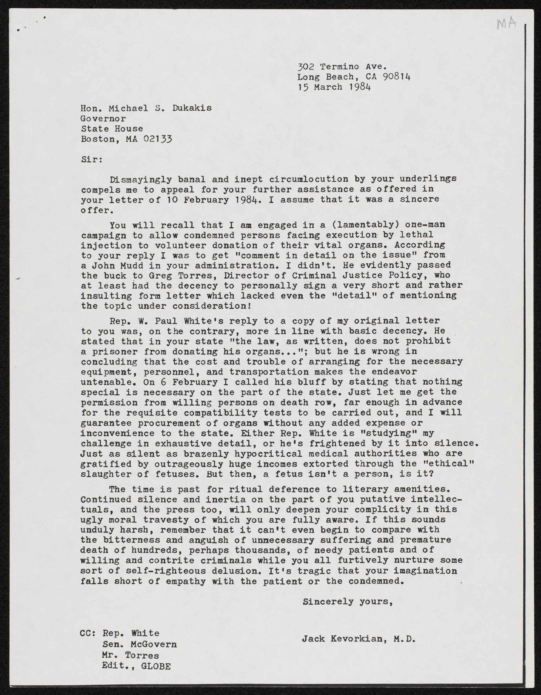 When Kevorkian did receive a response, without fail he squandered his opportunity to get a serious hearing. A case in point is his rather one-sided correspondence in 1984 with the governor of Massachusetts, Michael Dukakis. Kevorkian originally sent Dukakis his form letter in 1982 and received no response. But when Massachusetts took up the death penalty question in 1984 — Dukakis opposed its reinstatement — Kevorkian wrote to him again, reiterating his proposal.