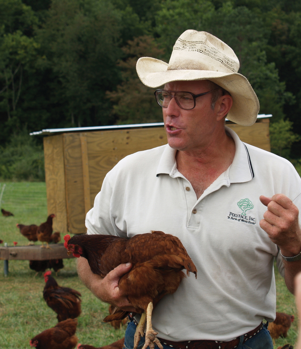 And the farming operation, too. When the tractors line up next to a row of chicken houses, it soon becomes clear that this is a well-rehearsed performance. Salatin gabs into a microphone headset while he demonstrates the movable chicken coops that he’s famous for. “One person can move 4,500 birds in sixty minutes with nothing more than that little tool, no machines, no petroleum,” he says, using a dolly to pull the house onto wheels and sliding the whole operation a few yards up the pasture to the green grass underneath. “Now they have a totally new salad bar. New bedding,” he says. “Fresh bugs, fresh grass, fresh place to land.”